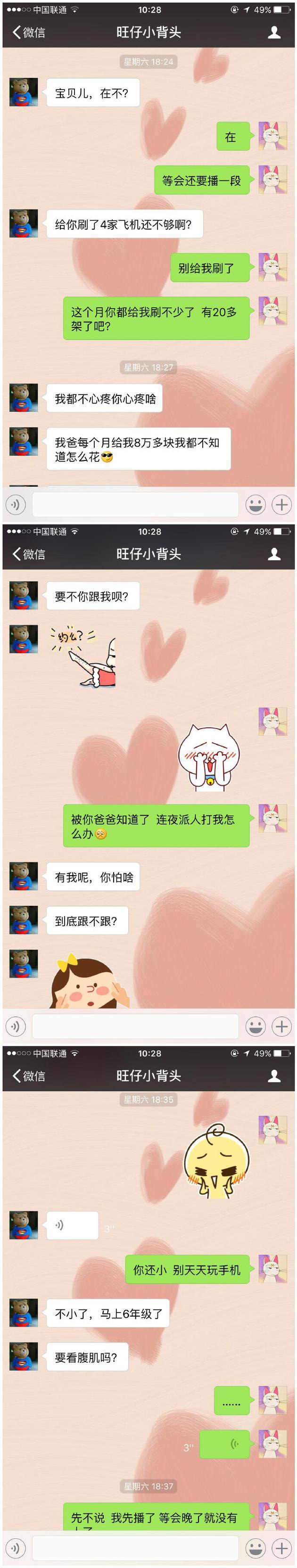 【月入10万女主播劈腿土豪小学生,男友上其公司撒尿报复】网爆近日有男子在网上发帖晒其女友微信记录,怀疑其女友出轨,而怀疑的出轨对象竟然是一名小学生。两人因此大吵乃至分手,在数次联系女友未果之后,男子一怒之下深夜赶到其公司门口撒尿,扬言要女子付出代价。据了解,女子为上海某传媒公司网络主播,月入超10万。