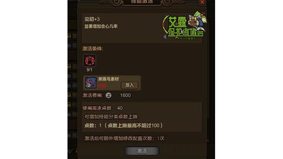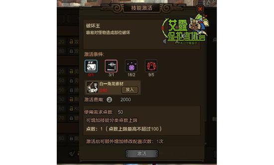 A:促使小编我写这个的原因之一,系统把技能分为“不可激活”、“可激活”“已激活”三种,而我则把技能组的技能分为了“现在没开放所以不能解锁”“你现在材料不够所以不能解锁”“你材料够了可以解锁”“你已经解锁了”四种类型。比较简单的办法是把鼠标放上去,现在没开放的技能底下会显示“未开放”,而材料不够的则是“查看激活条件”。