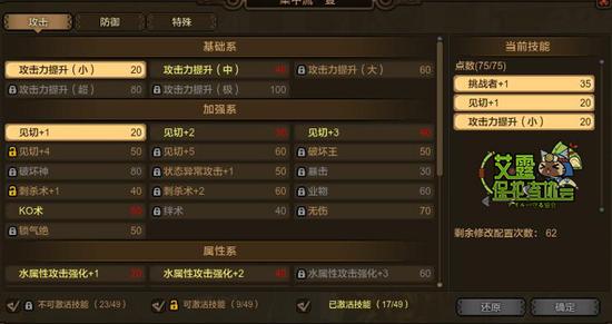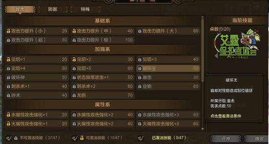 A:这里需要明确一个规则:猎装本身有的技能是不会出现在技能组里的。所以属强流的技能组里,攻击—属性这一类是没有的!这意味着属强流的猎装 技能组比其他猎装少了十多个技能,所以点数的提升难度也相较更高。我大概数了下,属强流技能组不需要币解锁的技能(只需要某只怪的素材就能解锁),攻击类 有3个、防御类有26个、加强类有11个,换句话说在不用币的情况下,属强流有大概60点初始技能点。选择1个20点的技能+1个40点的技能基本就没 了,所以提升对于币的花费很大。