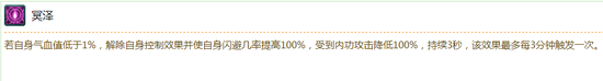 奇穴-冥泽-若自身气血值低于1%,解除自身控制效果并使自身闪避几率提高100%,受到内功攻击降低100%,持续3秒,该效果最多每3分钟触发一次。