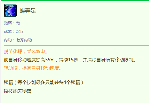 蝶弄足-清除自身所有移动限制,使自身闪避几率提高50%,不受招式控制效果影响,持续6秒。