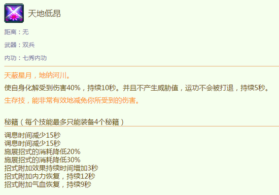 天地低昂-使自身化解受到伤害40%,持续10秒。并且不产生威胁值,运功不会被打退,持续5秒。