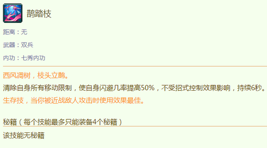 鹊踏枝-清除自身所有移动限制,使自身闪避几率提高50%,不受招式控制效果影响,持续6秒。