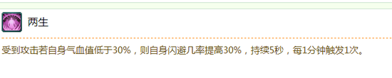 奇穴-两生-受到攻击若自身气血值低于30%,则自身闪避几率提高30%,持续5秒,每1分钟触发1次。