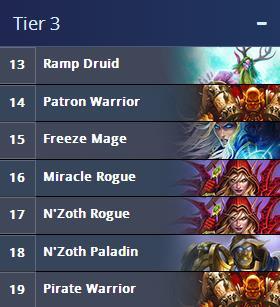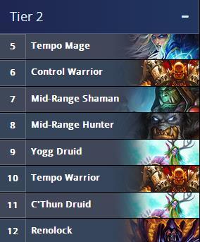 本周:火妖法,防战,中速萨,中速猎,萨隆德,节奏战,克苏恩德,宇宙术上期:中速萨、火妖法、中速猎、龙战士、克苏恩战、克苏恩德、冰法、萨隆德、奇迹贼T2 的套牌不管在顶端还是低端在目前的meta中都能找到自己的位置,但也各有各的不足。火妖法变数大,T2的战士卡组会被T1和同T2的卡组所牵制,中速萨 和中速猎虽然可以制裁战士,但快攻来了胜算不保证。萨隆给了小德新的清场手段,前期紫罗兰教师稳住场面,但你能活到10费吗?奇迹贼继续没落到T3