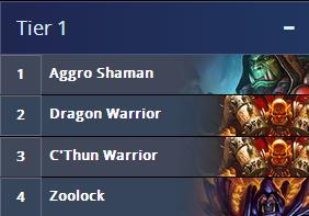 本周:打脸萨,龙战,克苏恩战,动物园,上期:防战、打脸萨、节奏战、动物园打 脸萨自身不光超越了别的快攻卡组,面对控制套牌依然也有很高胜率,能从各种类型战士的夹击中胜出也不会太意外,因为对手根本活不到6费。而之前的节奏战已 经逐渐被曲线更加流畅的龙战所代替,龙战有一个好处,同样作为中速卡组它能有天胡起手,阿莱克斯塔萨的勇士加库卡隆精英卫士,能很快结束战斗。克苏恩战作 为防战的变种是T1唯一的慢速控制,可以面对快攻但这种被誉为all be all的套牌,面对龙战和中速猎还是小吃亏。动物园常青树不提了。