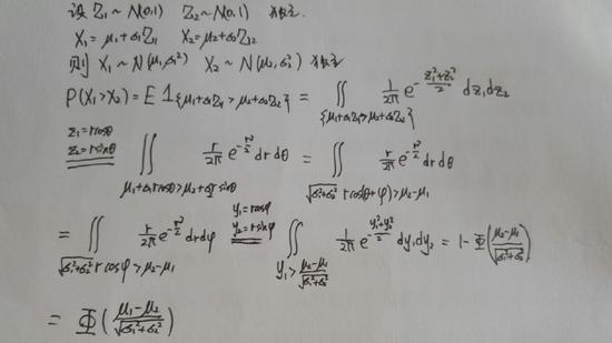 既然炉石有如此多的随机,风险管理就极其重要,同样的场面,同样的手牌,有些人可以做到75%概率解场,有些人却只有25%,除非涉及到收割机传送门之类的牌,其他的概率都较好计算,场面生物较多,火妖机关枪等随机伤害点数较高时,计算量会很大,但是,算好概率是打好炉石非常重要的一步,虽然很多玩家凭感觉可以打出最优解,对于那种选择50%八二开,50%一九开还是保持四六开就另当别论看个人斟酌,不过我们之前在炉论二里说过,最优解一般而言是唯一的还有一点想说的是,即使是0概率的事件也会发生(不过这在炉石里不可能),所以我们不能以结果定英雄,有的人打的巨臭无比却能一路获胜晋级,有的人打的无懈可击却败给了运气只能默默含泪逃跑,阿根廷无冠不能否认梅西在国家队上的成就,飞机安全抵达不能抱怨白买了那份保险,原油价格上涨不能因为白花了几个亿就把买看跌期权的人给咔嚓了常常有人问我,比赛该带什么卡组,我一般还是建议带厉害的卡组,也就是毒瘤,虽然我很喜欢去抓某个职业,但经验告诉我这不靠谱现,在我们假设这样一个模型,一局炉石双方的卡组抓牌还有各种随机事件等等我们可以有一个评分,对局的胜负取决于双方的评分,高者胜,低者负,这里忽略了不常见的平局,大家应该都知道中心极限定理,最简单的就是一个随机变量的独立试验之和会趋于正态分布,当有很多乱七八糟的事件叠加时,这个分布往往也会趋于正态分布,所以,我们假设之前所谓的评分服从正态分布N(mu,sigma平方),mu是均值,我们认为一套牌的强度越高,玩家水平越强,mu的值就越大,sigma是标准差,根据我的经验,一套牌曲线分布越不均匀,随机卡牌越多,过牌越少,玩家打法越激进,那么sigma的值就会越大现在我们设两个玩家的评分独立地服从正态分布N(mu1,sigma1平方)和N(mu2,sigma2平方)然后我们来计算双方的胜率。