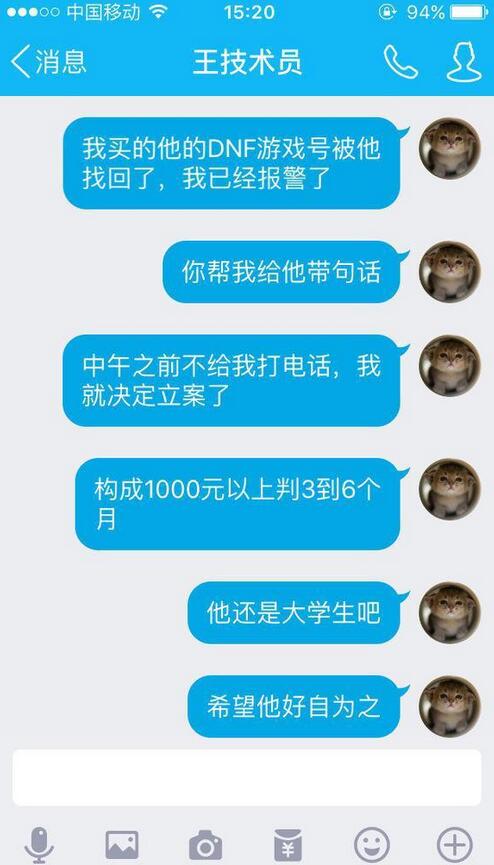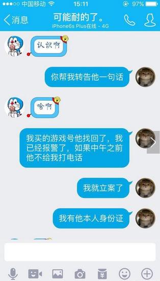 我马上给我在公安局工作的姐夫打电话,跟他说明了下情况,因为我有卖家身份证,可以调到他的所有信息,其中包括他父母的等等,但是心里还是觉得尽量 大事化小吧,我知道卖家身份证和电话号等,就加了卖家QQ,他有问题提示,我加不上,只好进入他空间,发现了他的好多好友留言,就想到加他朋友让他朋友给 卖家带句话,让他联系我。