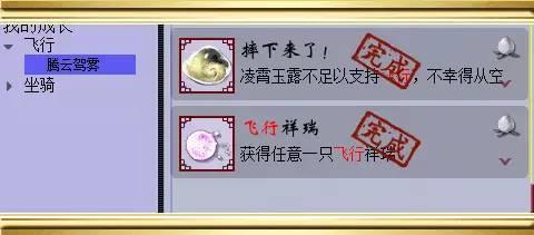 使用飞行祥瑞飞行,当凌霄雨露不足时,会摔下来,虽然摔得有点痛,不过能获得1点成就!小美推荐小伙伴们可以先完成这个成就再完成充满凌霄雨露的成就,这样会更科学一些,另外玩家在获得第一只任意的飞行祥瑞后也会获得1点成就。