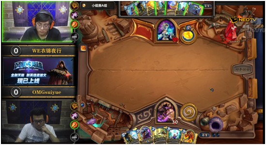 首盘较量夜行用动物园术士迎战Zing的奶骑,这位民间大神打法十分稳健,2费利用末日预言者断了动物园的节奏,之后在夜行动物园术士两度铺场的情况下,骑士用两个炎术士平等完成清场,10费以后双方陷入胶着,夜行在下末日守卫时出现失误有一张灵魂火没打,但这并不影响本局的结果,术士在打光所有手牌之后失去了场面优势,奶骑最终顶住了动物园的攻势,拿下本局,Zing1:0取得领先;第二盘动物园术士内战,夜行的先手术士开局就占据主动并且在5费利用穿刺者和死亡缠绕完成对Zing的清场,Zing在6费选择认输,1:1,双方战成平手;第三盘夜行用带了许多AOE的火妖法师挑战Zing的动物园术士,法师在前期十分劣势的情况下利用暴风雪和烈焰风暴完成翻盘,2:1,夜行反超了比分;第四盘Zing继续使用动物园术士而夜行这边则是图腾萨满,Zing的动物园似乎不是走运,铺场一直占于下风,最终在萨满的8费回合,夜行利用场攻和手中的熔岩爆裂斩杀了对上取得了比赛胜利,3:1,WE衣锦夜行首战告捷!