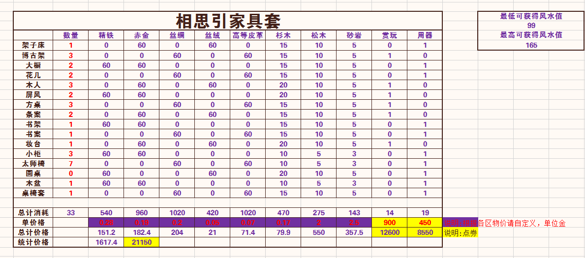 天涯明月刀 二级家具相思引材料消耗统计