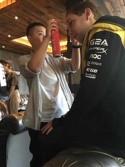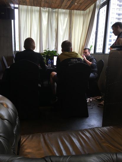 在第一局里输给DrHippi后,Izoro并没有太大的压力,在休息室里选择了闭目养神或是安静的看比赛,等待自己下一场比赛的开始;而一旁的国外选手则比较热闹,围在一圈热烈的讨论着比赛。不过这次比赛的目的之一就是为了给选手提供一个线下交流的机会,但由于性格内向和语言不通的缘故,所以这次只让说英语的选手们融在了一起,还是有点遗憾的。