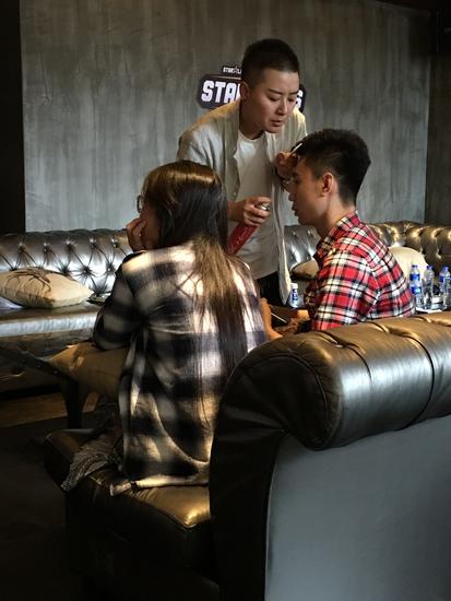 比赛时间到了,化妆师在为选手打理发型,而两人都聚精会神的盯着屏幕,生怕错过比赛的任何一个环节。不过说实话,Hoej任由化妆师随意摆弄他的头发,化妆师也是非常尽心尽责,感觉喷了好多定型水,然而我居然前后的一点差别都没看出来。