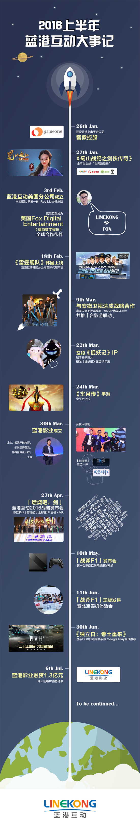 上周五,蓝港互动发布了一张年中总结信息图,对2016年上半年以来的业务布局进行了盘点。今年以来,蓝港互动不仅发布了多款手游新品,在韩国、北美等海外市场崭露头角,也将业务从移动游戏拓展至影业和主机,沿着“影漫游”三位一体和打造全球化IP的战略稳步前进着。
