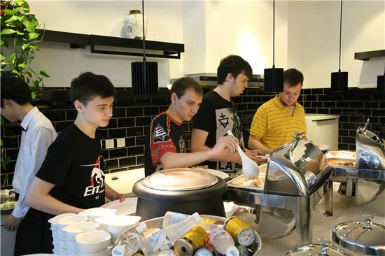 餐饮区在比赛期间不间断提供自助式的餐点,选手随时可以用餐,从中式的米饭配菜到西式的意面点心,水果饮料咖啡一应俱全,满足国内外战队选手不同的饮食需求。而除了餐饮区之外,选手还可以来到相对安静和别具一格的咖啡区,凭选手证件免费享受即时出炉的餐点和饮料,一边享受美食一边观看微鲸电视大屏幕中正在播放的比赛。咖啡厅旁的零食店也随时供应着各式小吃与预装饮料,让选手们选用。
