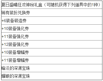 DNF每个夏日套内置1个神秘礼盒,购买2套以上每套可额外获得1个夏日盛晴狂欢神秘礼盒,下面是礼盒内容。