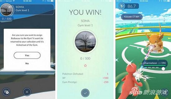 在该版本中,多名(这个数字足够大)玩家可以结队共同对道馆展开攻击。在我们(两名玩家)尝试一次夺取道馆的战斗中,我们可以在各自的手机屏幕上看到队友正在战斗的精灵。