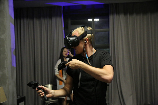 当然,除了热血青春少年的篮球之外,时下非常热门的VR虚拟现实体验设备也让选手们过了一把瘾,这不,美洲区DC战队的MiSeRy选手在获得了比赛胜利之后便迫不及待的来到VR体验区玩了一把打僵尸!