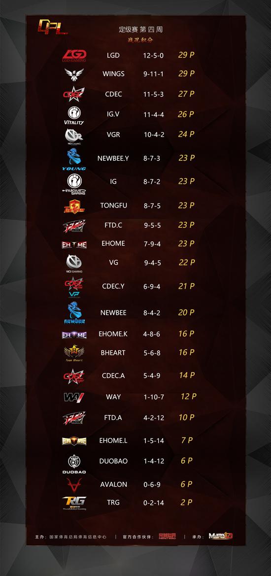 DPL中国DOTA2职业联赛·定级赛第四周积分榜: