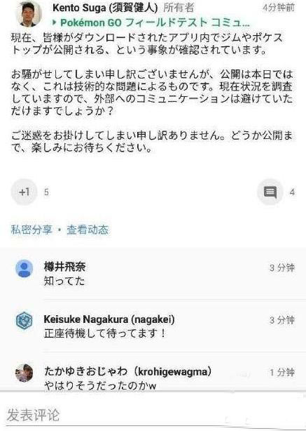 不开玩笑,原文翻译过来是这样的:我们得知大家在已经下载的游戏中看到了精灵站和道馆这个消息。抱歉惊动了大家,但是游戏并不是打算在今天上线的,这个问题是一些技术原因造成的。我们正在调查具体情况,请各位不要再继续往外说“可以玩了”好吗?非常抱歉。还请大家继续期待我们正式发布的那一天。