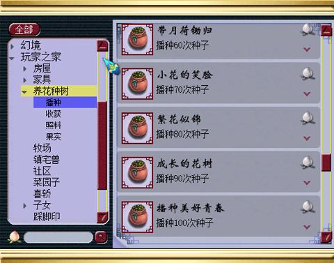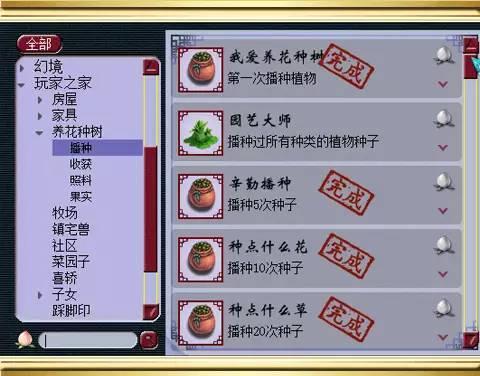 首先我们来看养花种树中的播种成就,这个播种成就拿完一共能得到13点成就,玩家在家里面分别种植第1次、第5次、第10次、20次、30次花草……此后每10次依次递增到100次种植,都会得到相应的成就点数,另外玩家在家中播种所有种类的植物种子也会得到1点相应的成就点。