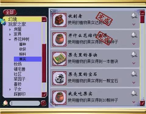 点评:最后一个是关于使用植物果实的成就,这个成就相对之前的成就而言难度系数有所提高,这里的成就点数总共是13点,玩家在使用植物果实达到100个的时候会得到1点成就,使用植物果实的时候得到1颗种子会得到1点成就,使用植物果实得到1本兽决会获得2点成就,使用植物果实得到1颗宝石会有1点成就,使用植物果实获得10颗种子会得到2点成就,使用植物果实获得10本兽决和10颗宝石是分别得到3点成就,总体而言,养花种树不仅能拿成就,还能给玩家带来乐趣和各种不错的奖励。