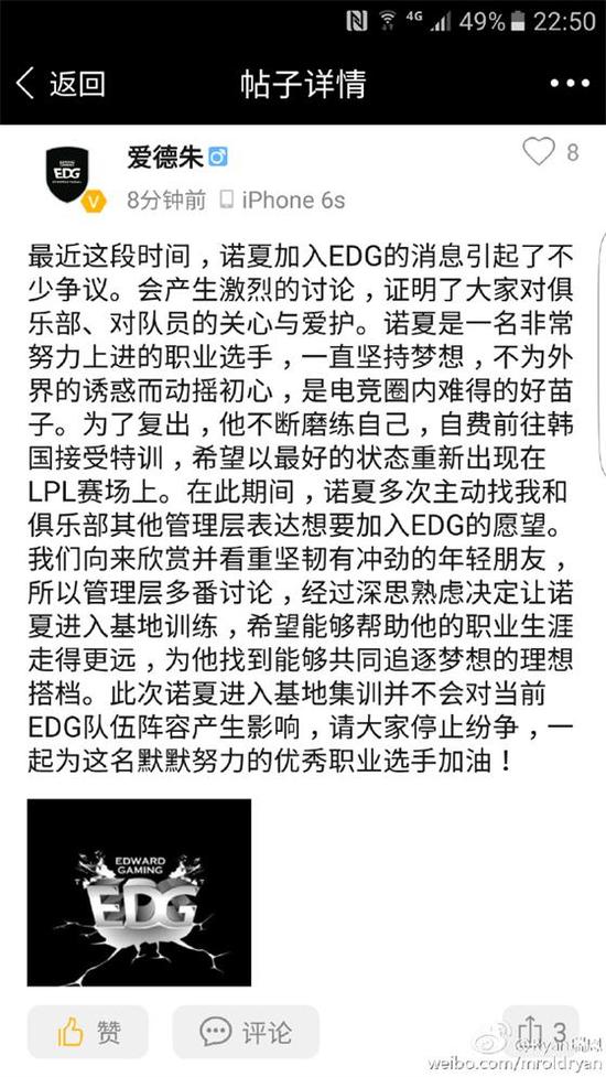近日,诺夏疑似加盟EDG的传闻闹得沸沸扬扬,外界也有不少说法称诺夏将顶替Meiko上场。为了防止舆论越传越偏,EDG俱乐部的老板爱德朱在EDG的官方APP里发表了声明。