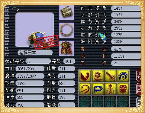 8技能善恶牛头,这个召唤兽的攻击资质是1437,体力资质和速度资质一般,成长是1.137,虽然成长有点低,但它不仅拥有8个技能,而且8个技能中还有特殊技能善恶有报,1798的攻击属性,如果恶报+高必,那么打出的伤害也是非常可观的。