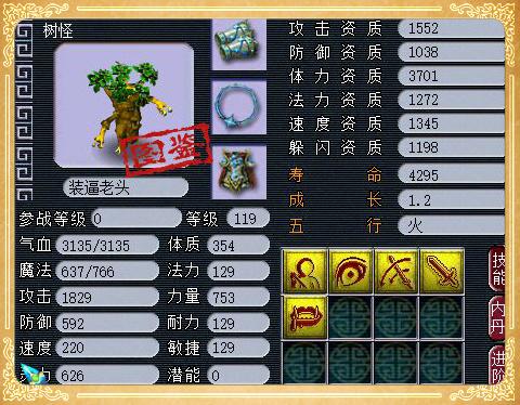 5技能全红树怪,这个召唤兽树怪的攻击资质是1552,其他各项资质和成长虽然不高,但是也不低,5技能的全红高连树怪在任务活动中宝宝装备佩戴善恶套,在PK中选择高神套都能游刃有余应对。