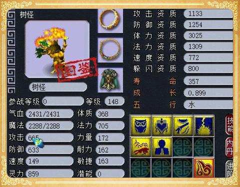 点评:6技能的蓝书树怪,这个召唤兽的各项资质和成长虽然都不高,不过依小道看来,老板绝对是对树怪这种生物有种特殊的爱,不然老板怎么会把它练到148级呢?