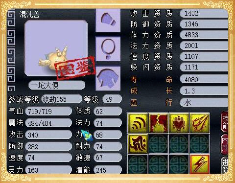 5技能全红的须弥混沌兽,众所周知,混沌兽是稀有召唤兽,而很多玩家在炼妖合须弥宠的时候都会选择画魂、泪妖之类的胚子,稀有宠+稀有宠之间炼妖不多见的原因一是稀有宠必带技能少,二是成本高,不过老板的这次高成本炼妖看来是值得的。