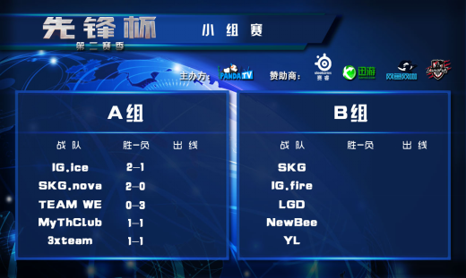 “先锋杯”小组赛第二轮昨日继续火热进行。A组之间各队继续激情的碰撞,比赛非常焦灼,打的难解难分:首场比赛WE依然没找到感觉,以微弱劣势输给SKG.nova;第二场比赛中,MyTHClub由于缺少主力输出KKsharp的强大火力,遗憾地负于3xteam;最后一场比赛卫冕冠军IG.ice遭遇了一些麻烦,和状态回勇的WE苦战三盘,最终艰难取胜,这样0胜3负的WE处境极为危险,想出线不止要靠自身努力,也需要对手的帮助。另外一场比赛中,3xteam同样苦战三盘战胜了MyTHClub。