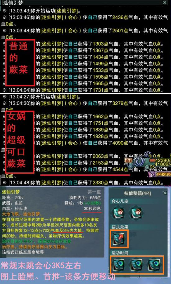 首先看一眼新版蕨菜的描述和数据,配装为精简五彩石,秘籍为JJC向治疗加效果。