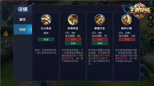 石之炼金(被动),增强钟无艳自身的控制能力;狂飙突进,钟无艳的位移技能,此技能使钟无艳更容易接近对手;震慑打击,此技能释放有一定延迟,但攻击范围很广;飓风之锤,大招是钟无艳的核心技能,而石化效果也让这个持续型大招更加恐怖。