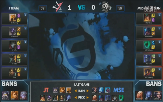 首局MSE 战队ban掉了中路刺客妖姬以及线上比较conter吸血鬼的冰鸟。而JT这边的Ban选就比较随意一些。中路的T1级别中单沙皇被禁用。在选人方面,MSE拿到了版本强势的吸血鬼以及下路的烬。而JT则是拿到船长搭配瑞兹和希维尔的团战AOE阵容。