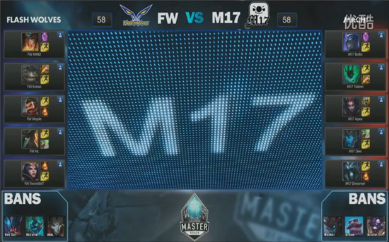 首局闪电狼拿到一个偏输出的阵容。搭配塔姆的保护,输出火力方面可谓威力十足。而M17这边除了就不上场的滑板鞋组合,还有就是让人眼前一亮的中单死歌。