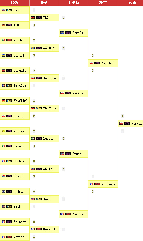 首先看一下《星际争霸II》方面。本次比赛我国的神族选手Jim也参加了。不过可惜的是在32强中被法国神族Lilbmow击败,无缘16强名单。看着16强中充满了横竖条的国旗唯独缺少五星红旗我们也是非常的惋惜。