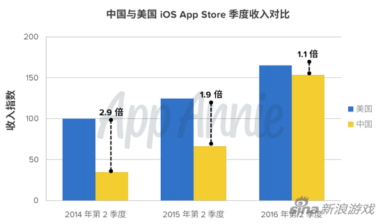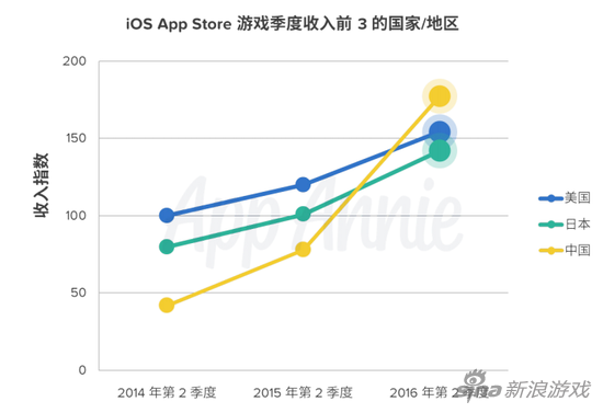 iOS应用商店游戏类应用的整体成功主要得益于中国市场的迅猛增长。从2015年第2季度到2016年第2季度,游戏是全球iOS收入市场占有率增幅最大的应用类别。游戏类应用的收入占到了全球iOS收入的75%左右,在如此巨大份额的基础上,仍能进一步实现增长,跻身iOS游戏收入首位,中国市场的爆炸式增长可见一斑。