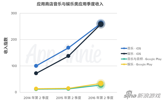 2016年第2季度,GooglePlay和iOS应用商店音乐和娱乐类应用的全球收入也呈现强劲增长。正如AppAnnie2016年第1季度的预测,随着消费者将越来越多地把钱花在视听享受上,不断增加的在线流媒体需求将持续推动收入增长。在iOS平台上,音乐应用在娱乐类应用中一直保持领先,但随着在线视频应用的不断壮大,两个平台的差距越来越小。