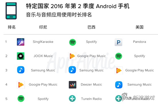 在线音乐应用在每月活跃用户数和收入方面竞争仍然十分激烈。Spotify在全球iOS和GooglePlay非游戏类应用综合收入中一马当先。2016年6月,Spotify宣布其用户数量已突破1亿大关。随着AppleMusic在WWDC上宣布改版,以及TIDAL凭借发布热门歌手的独家内容在今年表现持续强劲,竞争将变得更加激烈。但应用商店下载量和收入并不能全面的衡量在线音乐应用是否成功。时间就是金钱,使用量也是一个关键指标。热门在线音乐的使用模式存在巨大的地域性差异。