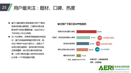 《(六月)中国Android生态大数据报告》:题材、口碑、热度最能吸引用户关注在吸引用户下载手游APP的原因方面,游戏题材及类型首当其冲,成为69.9%的用户下载手游的主要原因。与此同时,手游口碑及手游热度紧随其后,分别成为47.5%和43.9%的用户下载手游的原因,这两大因素对于20岁以下的年轻人群则更为明显。此外,有40.5%的用户下载手游APP源于曾经玩过同款或同类游戏,其中26-35岁年龄段的用户更容易怀旧,基于经典端游移植的同款手游对这部分群体产生了更大吸引力。