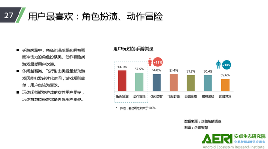在用户最喜欢的游戏类型分析中,男性与女性用户也表现出截然不同的喜好。女性手游用户更喜欢休闲益智类游戏,而男性用户则偏爱体育竞技类游戏。而在众多的手游类型中,用户最喜欢的当属角色扮演和动作冒险,玩过两种类型手游的用户分别占65.1%和57.5%,随后依次为休闲益智、飞行射击、经营策略、棋牌游戏及体育竞技。