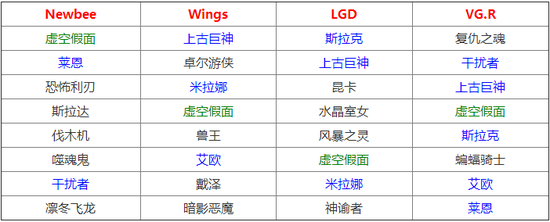注:蓝色标注为重复的英雄就算所选的阵容相似,但是打法风格迥然不同。拿LGD和VG.R为例,两支战队都会使用虚空假面、上古巨神和斯拉克,平均胜利时长均为33分钟。但是LGD常常会在逆风时表现出自己的韧性,比赛时长稳定;而VG.R则会把重心放在推进上,只要抓住机会就杀人拿塔,他们的比赛时长就难以预估。