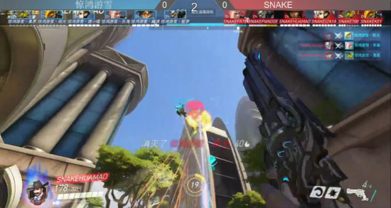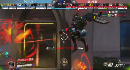 第一回合,SNAKE进攻。SNAKE选择直接突破的方式进攻,利用己方的高机动力,双飞的火力压制,在对方大量减员的情况下拿下一点,而后的比赛中,SNAKE战队的麦克雷精准点射,大招封锁及终结开大的法老之鹰,拿下进攻的胜利。