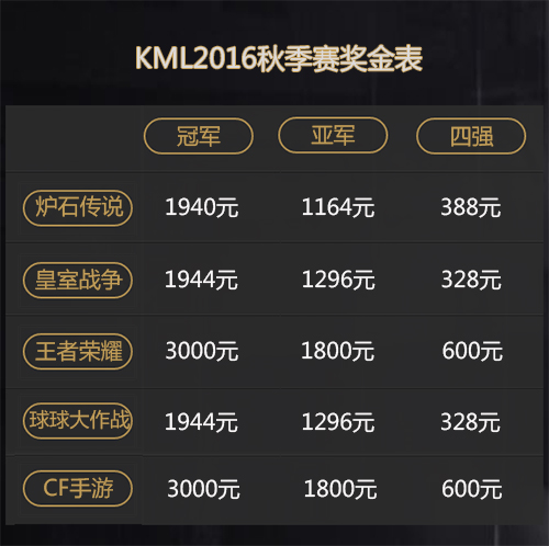 KML秋季赛囊括了《炉石传说》、《王者荣耀》、《皇室战争》、《穿越火线:枪战王者》、《球球大作战》五大时下最热门的手机游戏,分为海选赛、小组赛、淘汰赛、总决赛四部分。零门槛全民参与,高额奖励,冠军荣誉,等你赢!