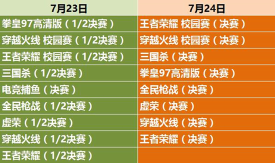 CMEG大赛首创公开征集评选比赛项目的方法,确定具有广泛群众基础的六大类移动电竞比赛项目涵盖了:动作类(ACT)、格斗类(FTG)、桌面类(TAB)、多人在线战术竞技类(MOBA)第一人称射击类(FPS)和益智类(PUZ)。具体项目包括:《穿越火线》、《王者荣耀》、《虚荣》、《全民枪战》、《拳皇97高清版》、《三国杀》、《电竞捕鱼千炮版》。