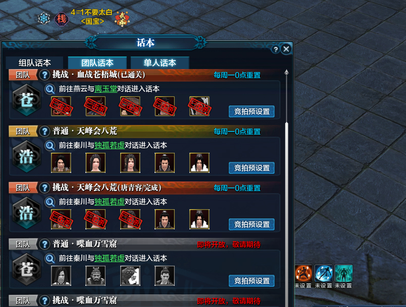 打完老三算通关吧,老四一个群里和光9000-1W血,对功力和血量硬要求太高,推荐全队1W9-1w95,有自信的队伍可以尝试。