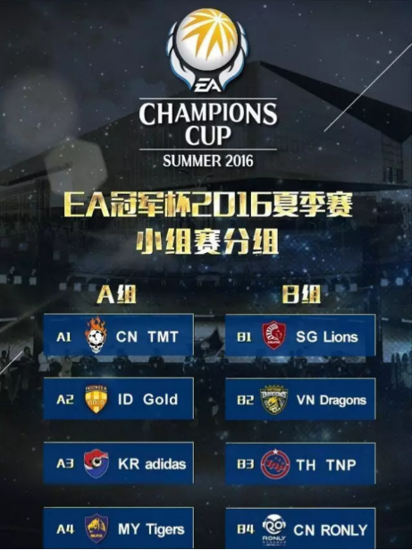 EA冠军杯2016夏季赛将集结来自中国、韩国、越南、泰国、印尼、新加坡、马来西亚等七个国家的八支战队,他们将历经两天“小组赛,半决赛及决赛”的比拼,角逐EA冠军杯2016夏季赛最后的冠军以及超过300,000美元的奖金。