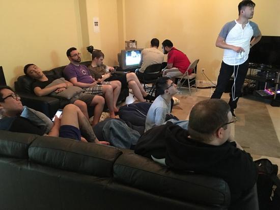 回到休息室以后眼前的一幕让我不得不感叹任天堂的魔力,大电视上直播着激烈的比赛,DC和Secret战队的两人隔岸对坐,气氛剑拔弩张,而此刻的背景音乐居然是旁边小电视里传出来的Pokemon主题曲,基本上从下午开始这台小电视前就一直坐着人,甚至还有个哥们已经准备好手柄站着等他们这局打完加入进去做3P了。