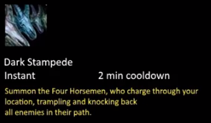 在目标点召唤四骑士冲锋,践踏并击退路径上的所有敌人。